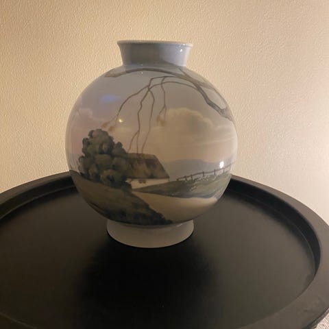 Bing & Grøndahl vase med håndmalet landskabsmotiv i gråtoner. Vasen har en rund form med en smallere åbning og er fremstillet i porcelæn. Den er dekoreret med detaljerede billeder af træer, skyer og landskab.