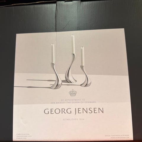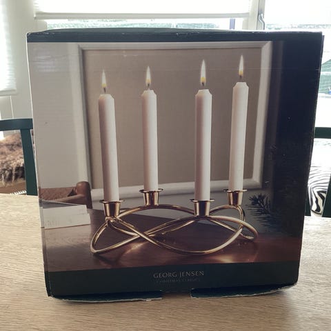 Georg Jensen lysestage i messing designet til at holde 4 lys. Lysestagen har en organisk og flydende form, der skaber et moderne og elegant udtryk. Materialet er messing, hvilket giver en varm og gylden finish. Velegnet til brug som dekoration i hjemmet.