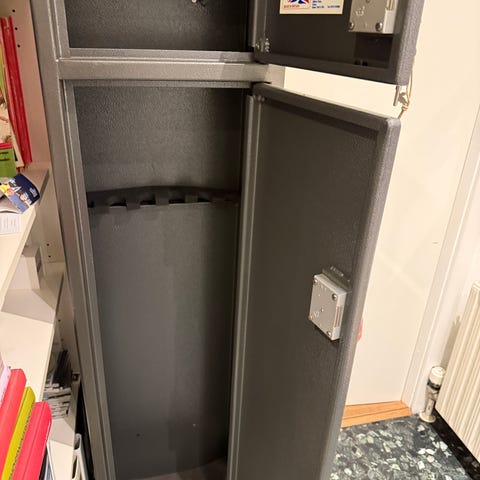 Indvendigt er der grøn filt, som beskytter våbnene og giver et eksklusivt, traditionelt udtryk. Velegnet til jagtvåben, salonrifler eller som dekorativ våbenopbevaring i jagtstue, herreværelse eller sommerhus.