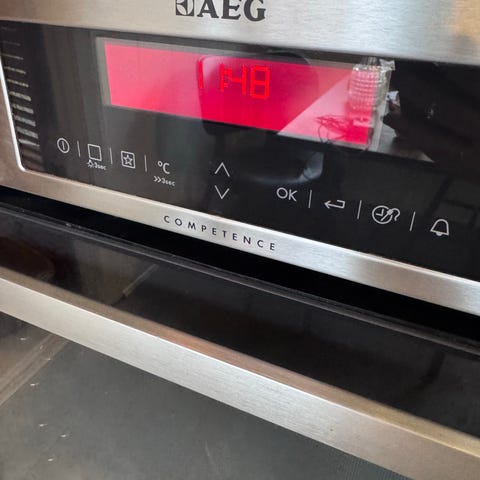 AEG varmluftovn i rustfrit stål med en effekt på 3,5 kW. Ovnens driftsspænding er 230 V ved 50 Hz.