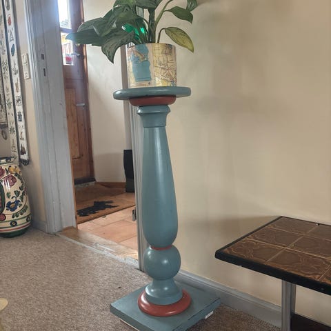 Plante piedestal med snoet design, udført i træ med en rund top og bund. Skulpturen har en naturlig træfarve og et spiralformet mønster på stangen.