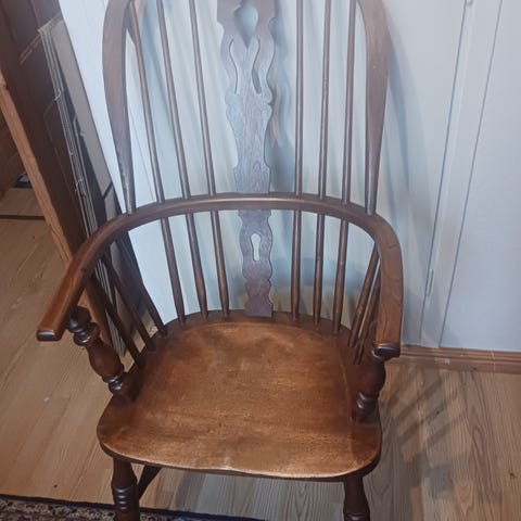 Træstol med armlæn i klassisk design. Stolen er udført i træ med en mørk finish og har et ryglæn bestående af flere lodrette spiler. Sædet er fladt og firkantet med afrundede kanter. Stolen har fire ben med tværstivere for stabilitet.