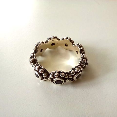 Eternity alliance fingerring i sølv med (hvad jeg mener at huske) ca 30 små zirkonia sten rundt.