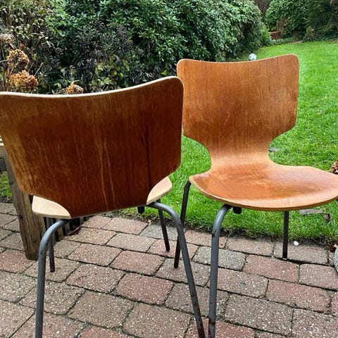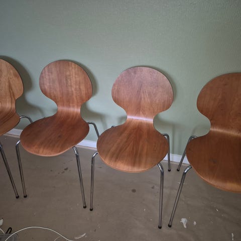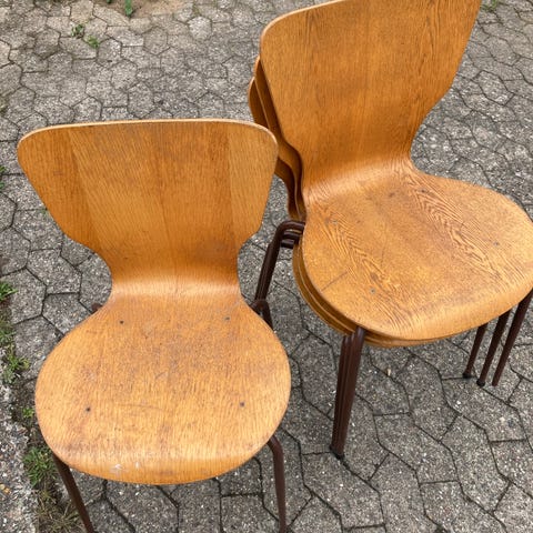 Smukke teak skalstole, fin kombination af klassisk og stringent design - har 5 i alt. 225 kr stykket.