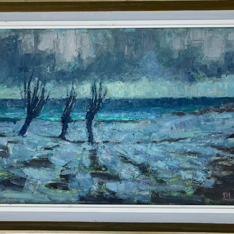 maleri med motiv af et vandhul. Maleriet er udført med tydelige penselstrøg og viser et naturlandskab med træer og vand. Signeret af kunstneren