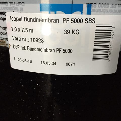 Icopal Topmembrane PF 5000 SBS tagmembran med dimensionerne 1,0 x 7,5 meter og en vægt på 38 kg. Produktet er designet til tagdækning og indeholder SBS (Styrene-Butadiene-Styrene) som materiale.