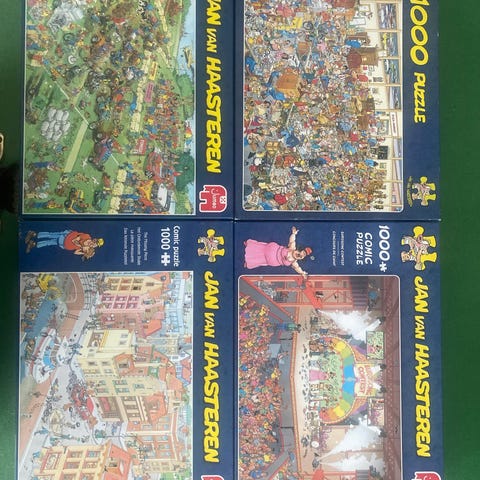 Jan van Haasteren puslespil med 1000 brikker. Puslespillet indeholder detaljerede og farverige illustrationer, der viser forskellige scener med mange figurer og aktiviteter. 60 kr pr stk eller samlet 150 kr. Jeg er også interesseret i at bytte med andre Jan van Haasteren puslespil med 1000 brikker. Hvis du bor på Vestfyn eller i Trekantsområdet, kommer jeg og bytter, så det bliver uden omkostninger for dig. Der kommer løbende nye puslespil.