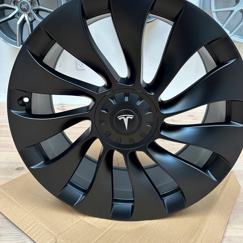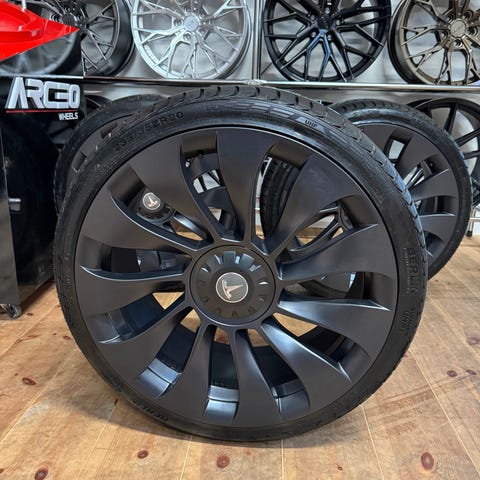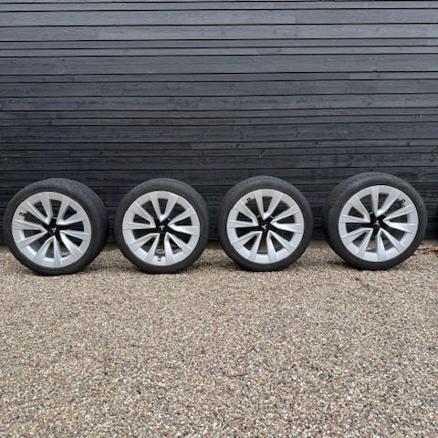 Jeg har fået disse mat sorte 20 tommer fælge med sommerdæk i bytte - de har siddet på en Tesla 3 Performance.