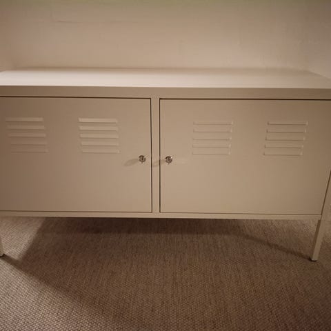 Stålskab på hjul med nøgle. Der er hul til kabler så det er egnet som TV skænk.
