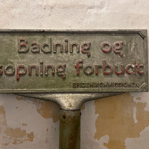 Branddam skilt med rød og hvid farve. Skiltet er af metal og har et rektangulært format med tekst og symboler relateret til branddam. Velcro mærke på den ene side. Kan tages af.