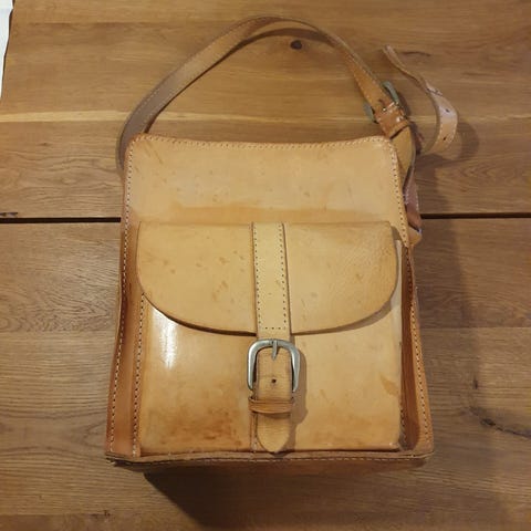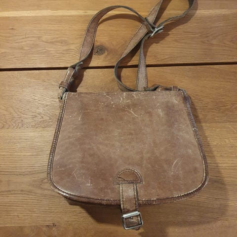 Skuldertaske i kernelæder.H 30/71 cm, B 34 cm.Gå til varen, for flere billeder.(Tasker 1).