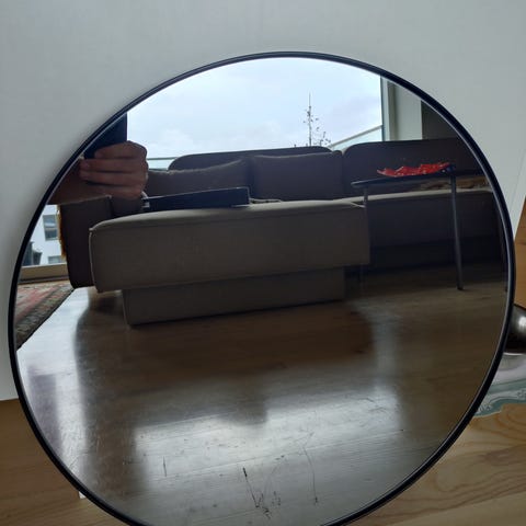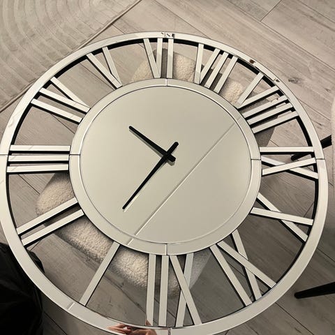Stort flot enkelt vægur med spejlglas. Sort metal ramme og sort rem.