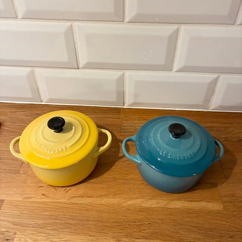 Originale Le Creuset. Fejler ingenting og fremstår som nye – ingen skår, revner eller brugsspor. Har stort set ikke været brugt og har mest stået i skabet.
