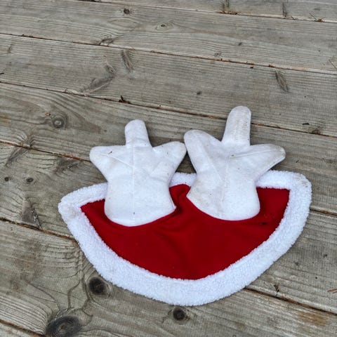 Julehue i rød farve med hvid kant og hvid pompom på toppen. Huen har to runde udskæringer foran, muligvis til øjne. Materialet virker blødt og egnet til brug som kostume eller pynt i julesæsonen.