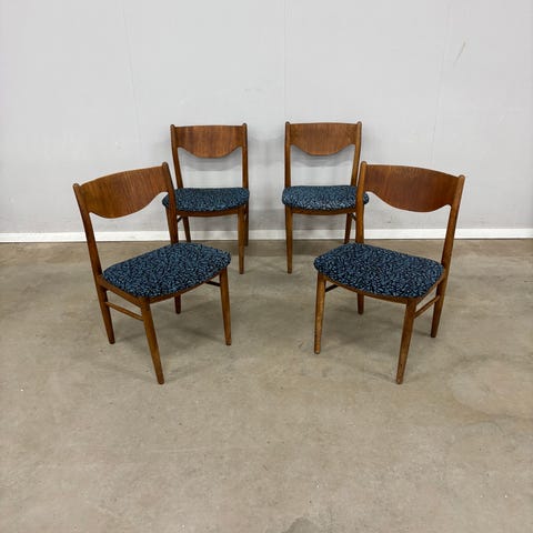 6 smukke soisebordsstoleni teak. Stolene er ombetruklet og polstret for et års tid siden. De fremstår flot med mindre hak men har jævnligt fået olie. De er dog blevet lidt bløde i samlingerne og kunne bruge lidt kærlighed.