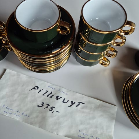 Stel bestående af kopper og tallerkener i mørkegrøn farve med guldkant. Sættet inkluderer kaffekopper med underkopper samt flade tallerkener og et to-etagers kagefad. Materialet er keramik, og designet er velegnet til servering af kaffe og kage.