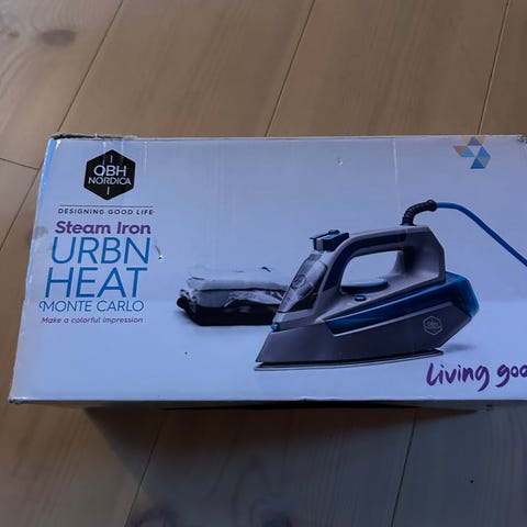 Helt nyt, har aldrig været brugt. strygejern i hvid og blå farve. Produktet inkluderer strygejern, målebæger og brugervejledning. Designet til almindelig husholdningsbrug.