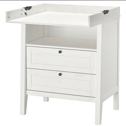 Skufferne kører, som de skal, men malingen er slidt og der er en stor ridse på den ene side. Den har fungeret super for os i mange år nu. Toppen kan tages af, samt foldes ud og ind. Trænger til en kærlig hånd med lidt maling og alt det der. Hurtig afhentning prioriteres.