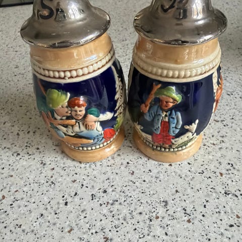 West Germany krydderisæt bestående af to krydderiglas og en bakke. Sættet har et retro design med orange farve og dekorative mønstre. Fi t sættet, intakt og lækkert retro. Kr 150 plus evt forsendelse