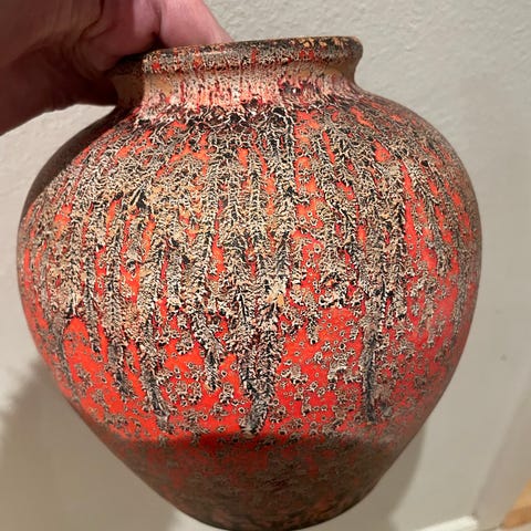 Keramik vase (stor )i turkis farve med sort dekorativt mønster. Vasen har en rund form med et bredt åbent mundstykke. Initialer BL 2012.