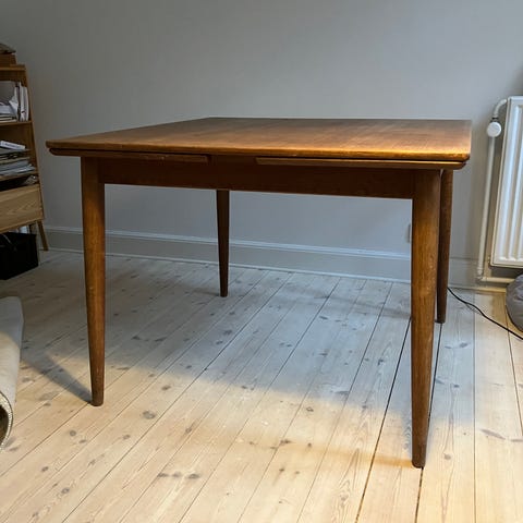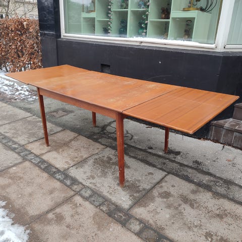 Retro spisebord i teak / eg med hollandske udtræk, fremstår med patina, mål: L: 120 / 168 / 216 x B: 80 x H: 74,5 cm