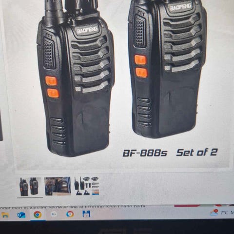 Baofeng walkie talkie sæt bestående af fem enheder med tilhørende håndmikrofoner og opladere. Enhederne har antenner og bærestropper, og mikrofonerne er med ledning til tilslutning til walkie talkierne. Sættet kan anvendes til kommunikation.