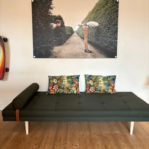 Monroe daybed i mørkegrønt stof med lyse træben og aftagelig nakkestøtte. Flot stand, bortset fra skade på remmene (se billede) - derfor den billige pris. L: 200 cm B: 84 cm H: 36 cm Nypris: 3000 kr.