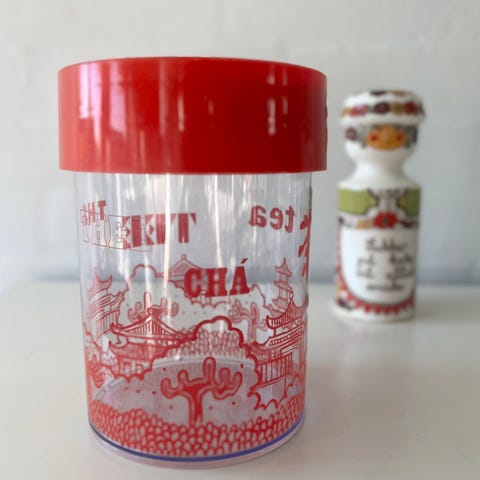 Erik Kold tedåse i plastik fra 1970’erne (model 6015). 15,5 cm høj og 11 cm bred. Rødt låg og asiatisk inspireret mønster. Har almindelige brugsspor og det ene ‘thee’ er lidt udvisket.