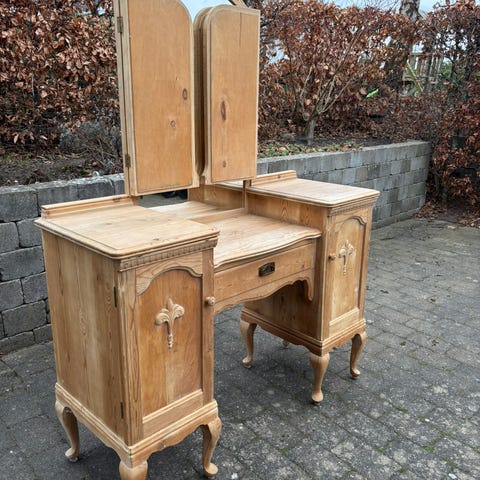Sminkebord/Toiletmøbel i egetræ,bordplade i sort Formica,opbevaringsrum med skydelåge.
