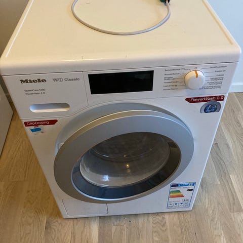 Miele frontbetjent vaskemaskine med PowerWash 2.0 og TwinDos funktion. Energiklasse A+++, kapacitet op til 8 kg, og et lydniveau på 46 dB ved vask og 72 dB ved centrifugering. Årligt energiforbrug på 130 kWh og 11.000 omdrejninger pr. minut.