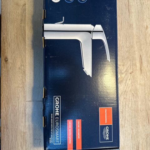 Grohe Eurosmart armatur til håndvask i krom. Armaturet har et enkelt greb og tilslutningsslanger. Designet er kompakt og egnet til montering på håndvask.
