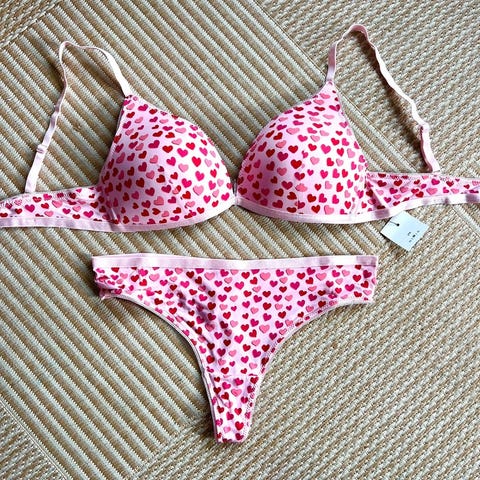 VRS BH og trusse sæt i lyserød farve, størrelse XL. Sættet består af en BH med blonder og justerbare stropper samt 2 matchende trusser med blondedetaljer.
