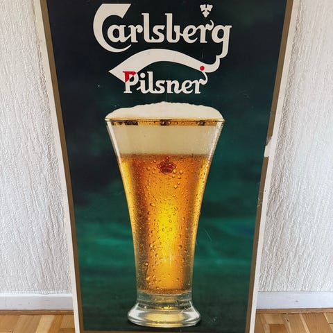 Carlsberg Pilsner skilt fra gammelt værtshus. Skiltet er monteret med et sort metalophæng til vægophængning. Skiltet er med lys og det virker. Måler 80 x 70 cm.