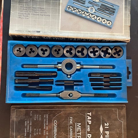 Helt nyt Tap & Die gevindskæresæt i opbevaringskasse,aldrig brugt med forskellige størrelser.