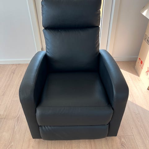 Sælger denne lækre HASSELAGER lænestol med fodskammel i sort kunstlæder fra Jysk – fejlkøb, så den er kun samlet og næsten ikke brugt.