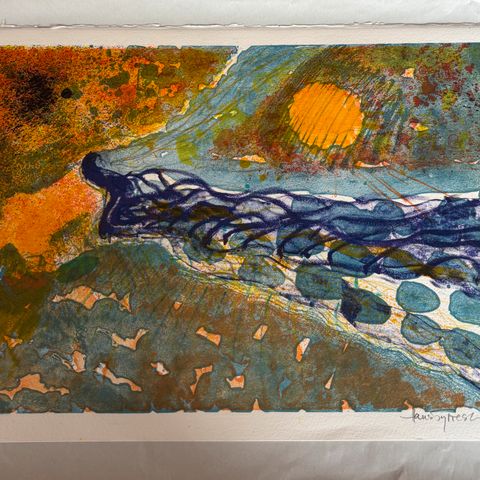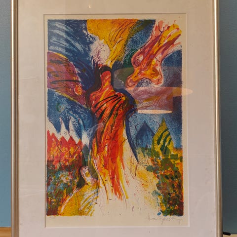 Litografi af Hans Tyrrestrup med et farverigt og abstrakt motiv. Værket er signeret og nummereret 106/150, er indrammet i en smuk sølvfarvet træramme.