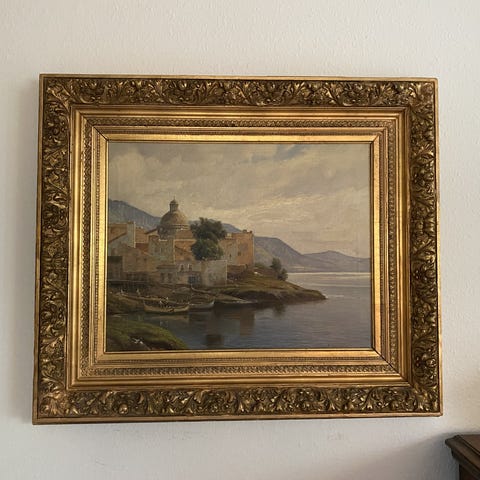 Maleriet forestiller et sydeuropæisk bjerglandskab, fra Interlaken-området.