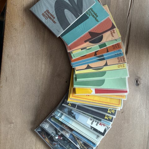 De Postverzamelaars frimærkealbum samling bestående af flere bind i forskellige farver og årgange. Albums er designet til opbevaring og organisering af frimærker og passer til samlere, der ønsker at holde styr på deres samling. Pris ved nordfirm omkring 3700 kr