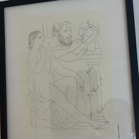 Super fin Picasso plakat indrammet i ramme af træ. Måler ca 47x57. Rammen medfølger, men bemærk der er et skår (se sidste billede), som man dog ikke bemærker, når den hænger. Skal afhentes på Vesterbro.