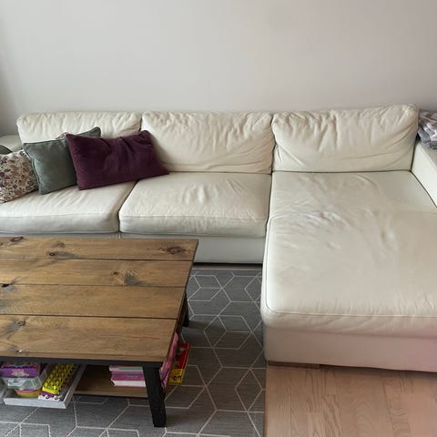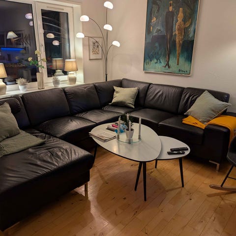 Lædersofa med venstrevendt chaiselong og puf fra IKEA.