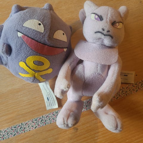 Fem små Pokémon bamser med sugekop i snoren, har været vasket i vaskemaskinen
