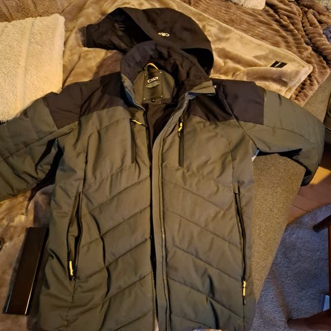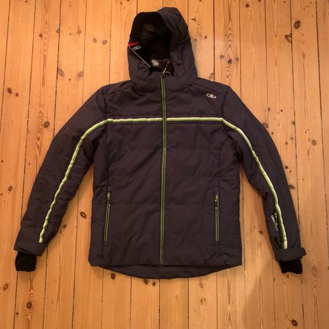 CMP Skijakke i sort farve, størrelse 54, passer til en XL. Jakken har hætte, lynlåslommer og reflekterende detaljer. Den er designet til ski og vinteraktiviteter.