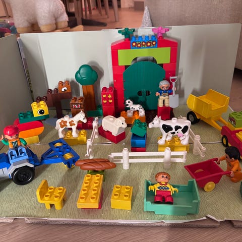 Stor Lego DUPLO bondegård med køer, gris, får, hund og hane samt traktor. Døre kan åbnes og lukkes, og kranen hejses op og ned.