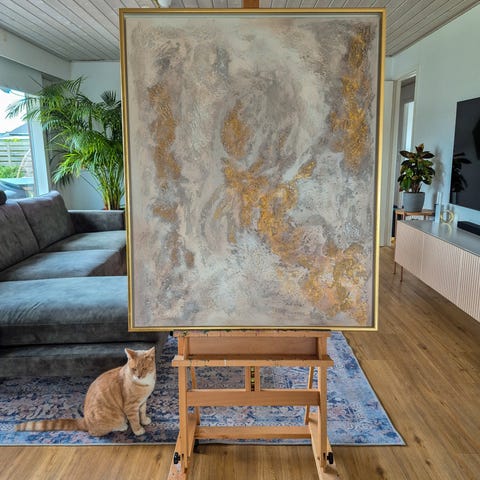 Dette maleri er malet ud fra en lyst til, at skabe ro mellem de lidt dybe farver og det gyldne på samme tid.