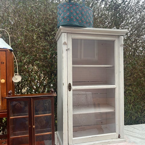 Fint gammelt vitrineskab i massivt træ med læderstropper og fire ruder. Låger lukker til med magneter.