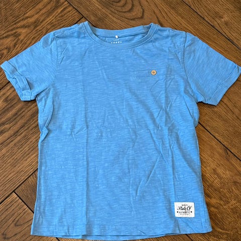 Fin T-shirt grå/grøn/blå, str. 134/140.