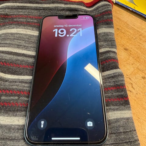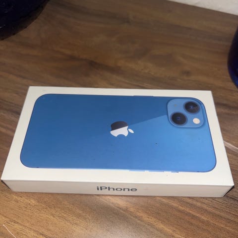 Apple iPhone 13 smartphone med 128 GB lagerplads i blå farve. Enheden har dobbelte kameraer på bagsiden og understøtter optimeret trådløs opladning. Batteriets maksimale kapacitet er 83%, hvilket indikerer brugt tilstand. Telefonen leveres i original emballage.