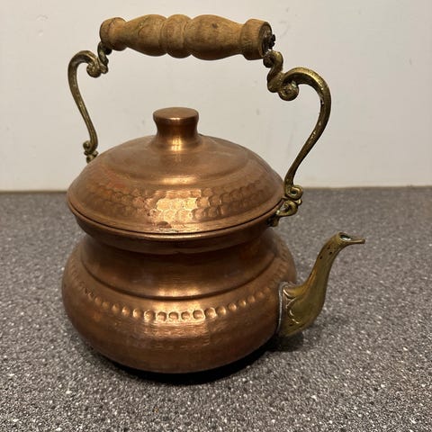 Tekande i kobber med låg og buet håndtag. Velegnet til brygning og servering af te. Materialet er kobber, hvilket giver et klassisk udseende. Diameter 12cm, højde 14cm