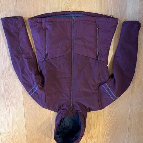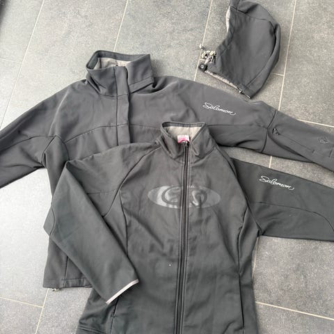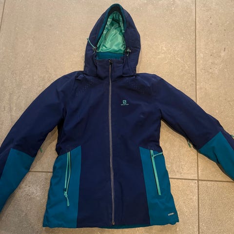 Salomon skijakke og buks til damer i størrelse M. Jakken er blå med gule detaljer og har en hætte. Indvendigt foret med turkis stof. Mange fine detaljer som snefang, lommer, lukninger mv.