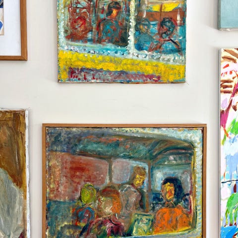 A.Kærgaard maleri med motiv fra Nygade i Randers, år 1950. Maleriet viser en byscene med bygninger og træer, udført i oliemaling på lærred. Indrammet i en mørk træramme.